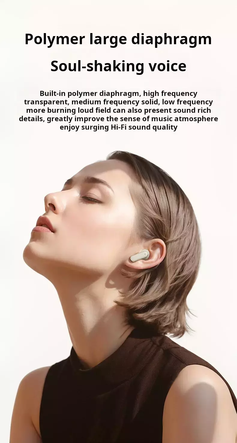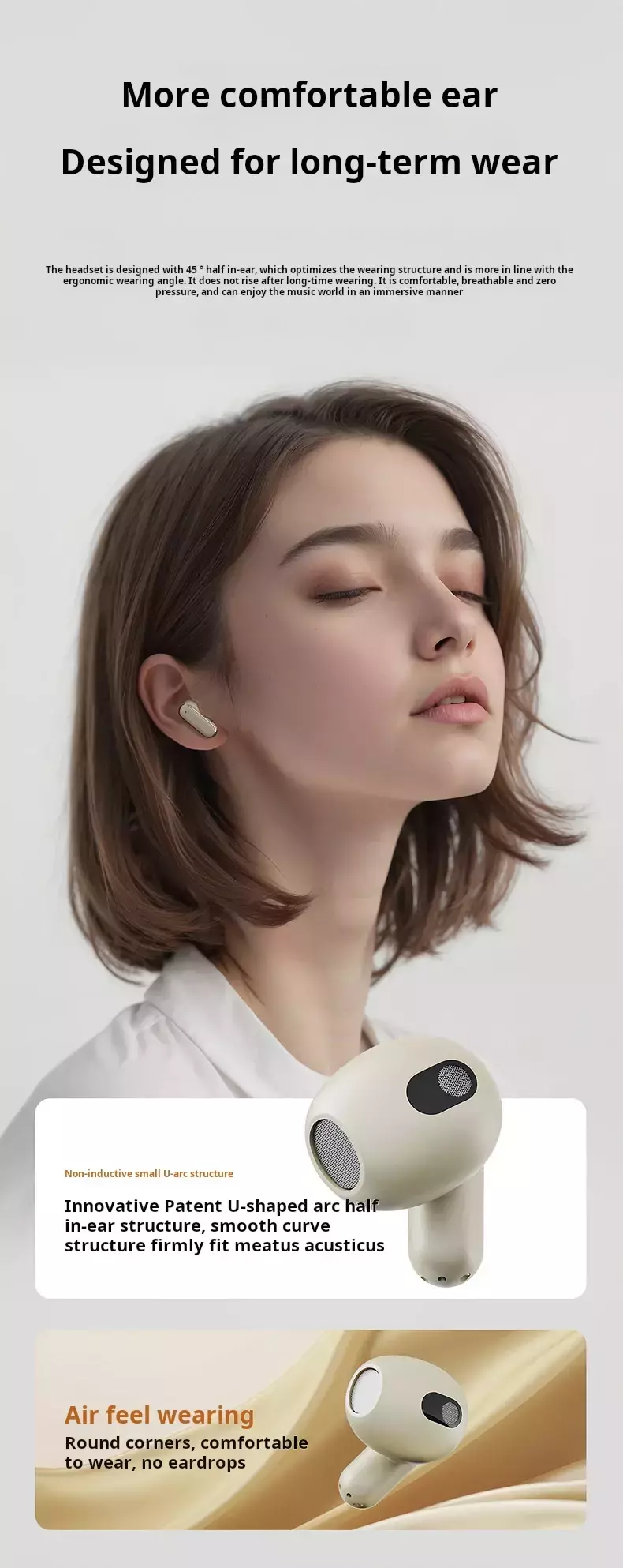O fone de ouvido foi projetado com 45° meio intra-auricular, que otimiza a estrutura de desgaste e está mais alinhado com o ângulo de desgaste ergonômico.Não sobe após uso prolongado. É confortável, respirável e com pressão zero, podendo desfrutar do mundo da música de maneira envolvente